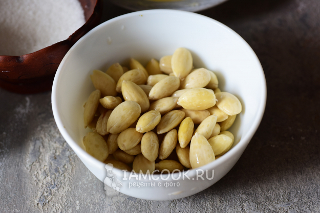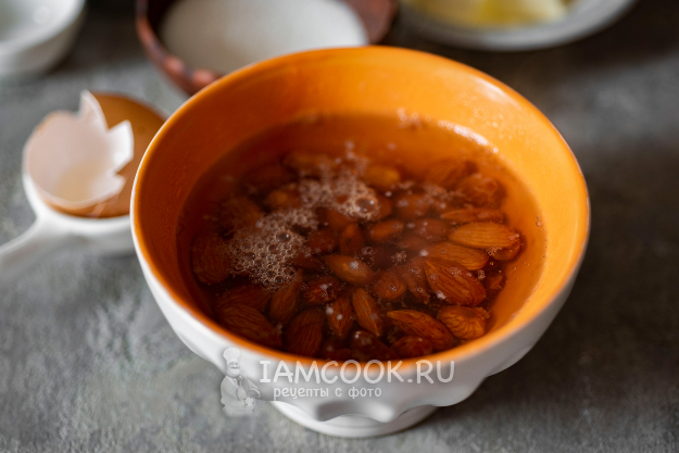 Займемся ореховой начинкой для булочек. Миндаль в миске зальем кипятком и оставим на 15 минут.
