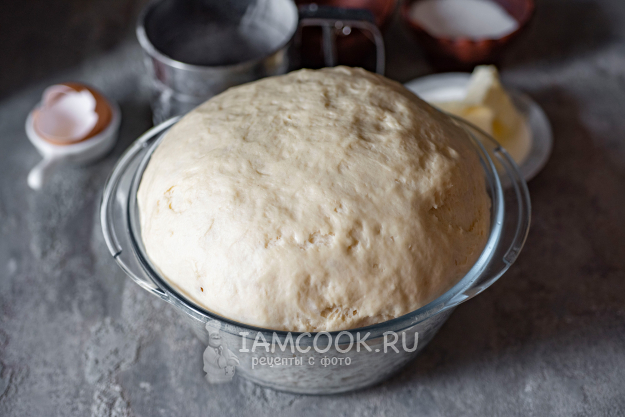 Тесто уже подошло - оно очень увеличилось в объеме и готово к дальнейшей работе.