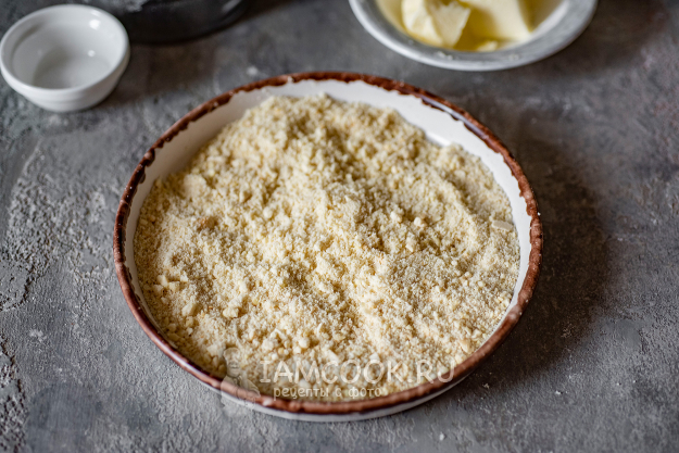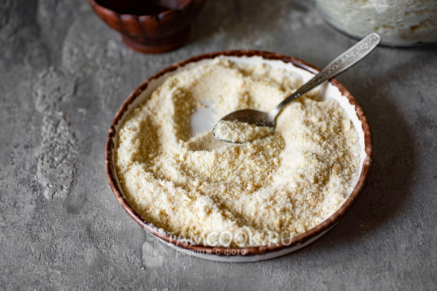 Очищенные орехи просушим в духовке до легкого золотистого оттенка при температуре 150 градусов, охладим и измельчим в кофемолке.