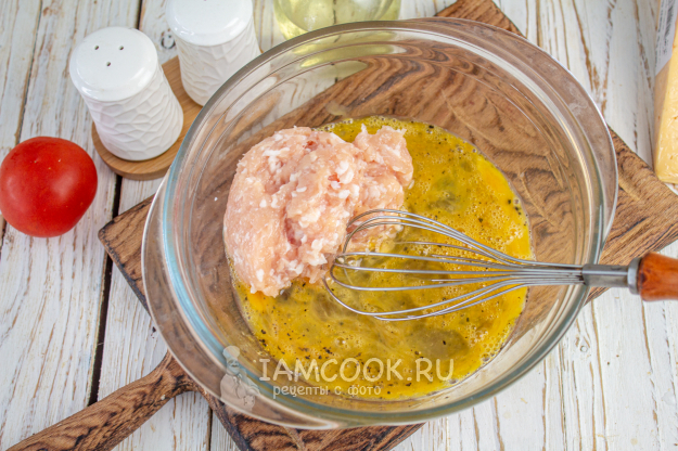Добавьте к яйцам фарш, при необходимости посолите и поперчите.