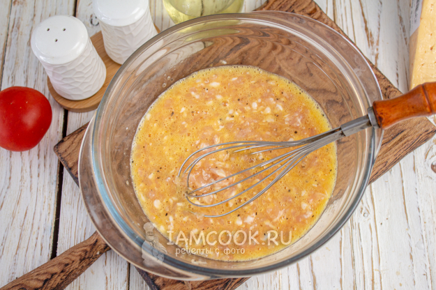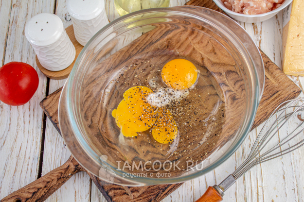Яйца вбейте в миску, добавьте соль и черный молотый по вкусу и перемешайте венчиком.