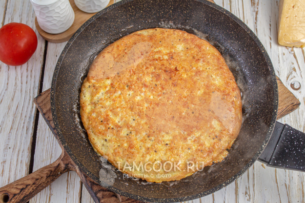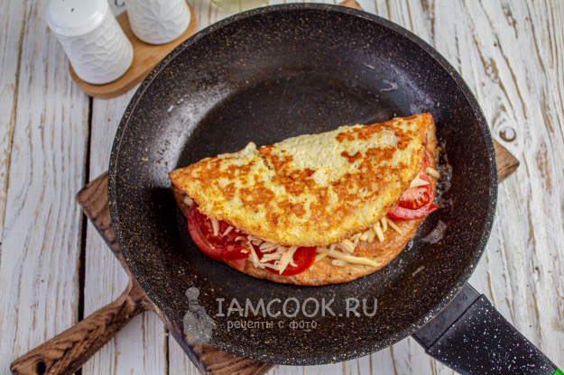 Свободным краем омлета накройте начинку, придавите лопаткой, готовьте еще по 30 секунд с каждой стороны.