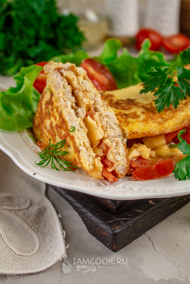 Переложите готовый омлет с куриным фаршем на блюдо и подавайте с листьями салата и свежими овощами.