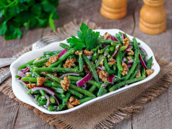 Посолите и поперчите блюдо. Соедините постный майонез с горчицей. Можно использовать французскую горчицу в зернах. Выложите соус на салат.