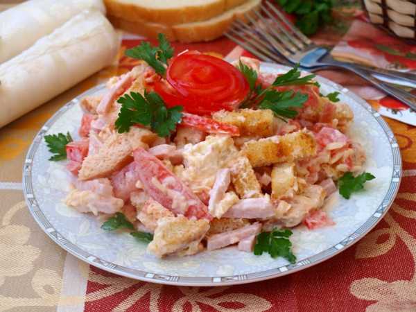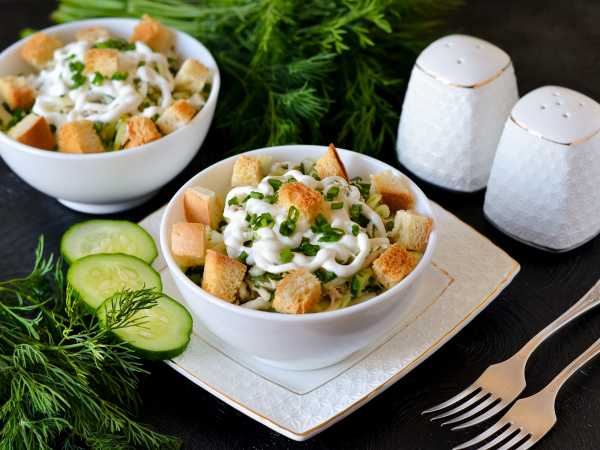 Нарежьте ломтики белого хлеба кубиками или брусочками. Очистите зубчик чеснока и натрите им дно сковороды и салатника. Выложите нарезку хлеба на сковороду и поджарьте примерно 2-3 минуты. Не забывайте помешивать, чтобы сухарики равномерно прожарились. Остудите их.