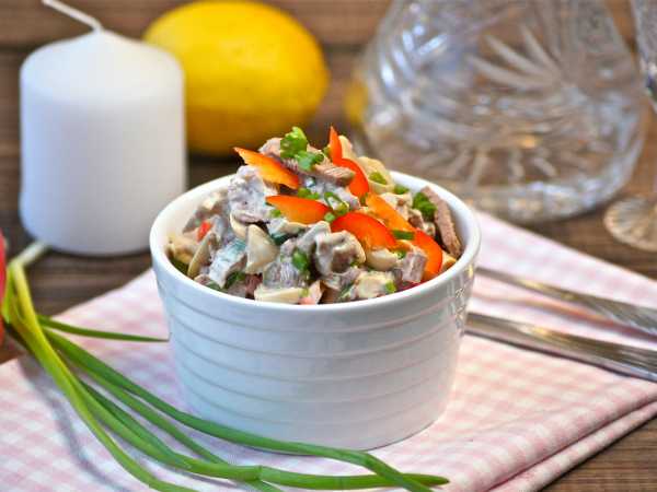Промойте маринованные грибы. Если они крупные, то нарежьте их на части. Выложите в салатник.