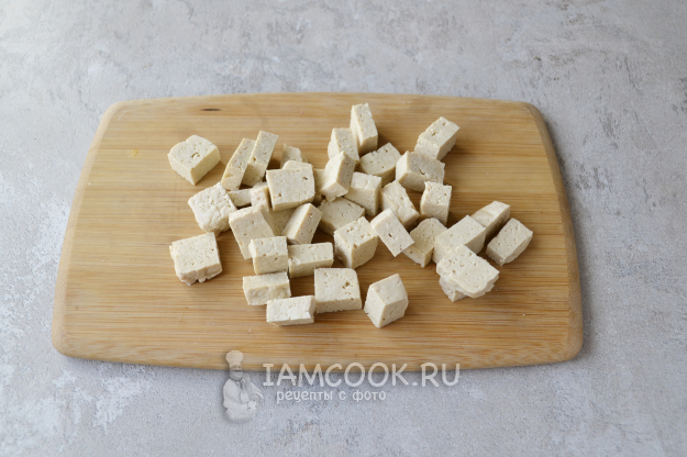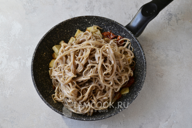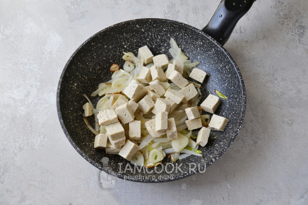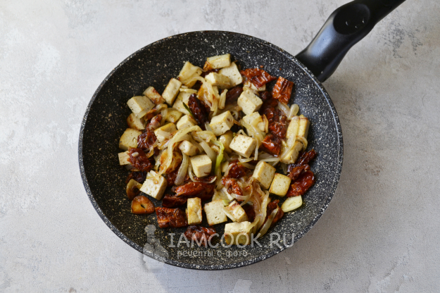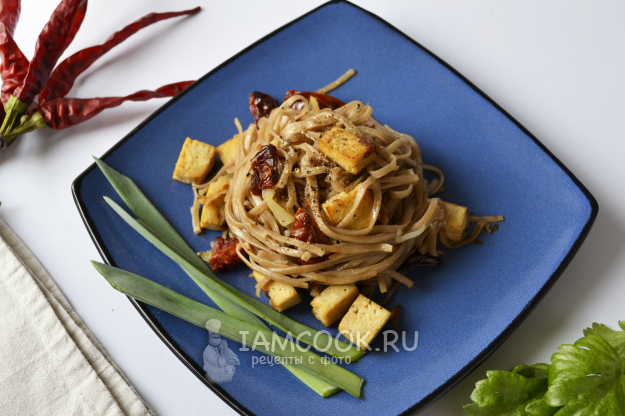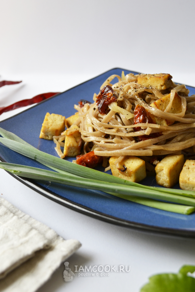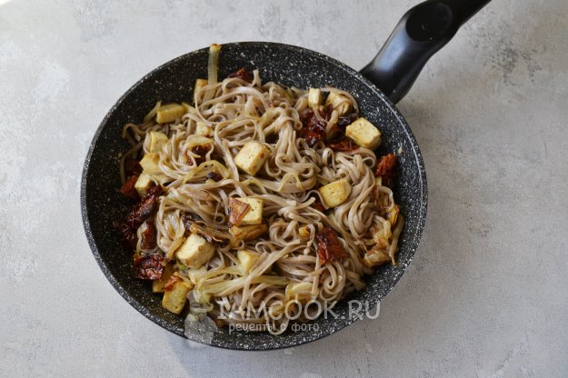 Перемешайте лапшу с луком, томатами и тофу и прогрейте еще 5-6 минут. Посолите и поперчите лапшу по вкусу.