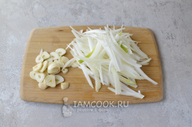 Очищенный лук нарежьте перьями, очищенный чеснок нарежьте кружочками.