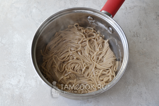 Сварите лапшу в подсоленной воде до готовности согласно инструкции на упаковке. Воду с лапши слейте. Влейте чуть-чуть растительного масла в лапшу и встряхните сотейник, чтобы лапша не слиплась.