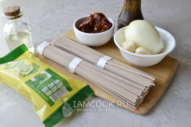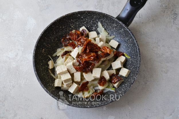Возьмите продукты для приготовления макарон с тофу и вялеными помидорами на сковороде.