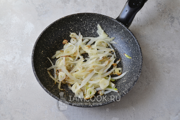 Разогрейте сковороду с растительным маслом и обжарьте лук и чеснок в течение 7-8 минут, помешивая.