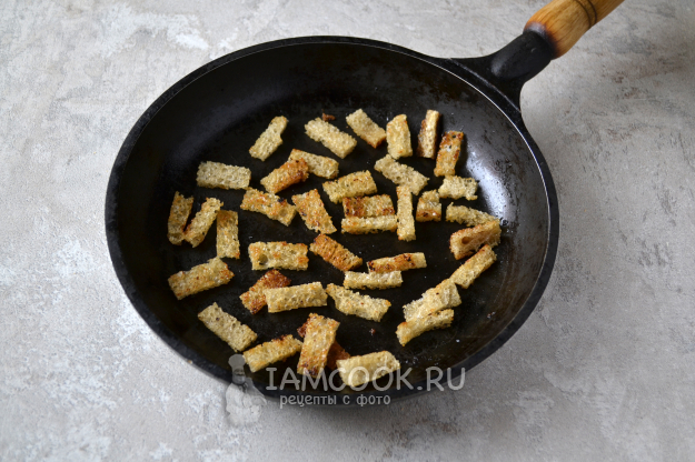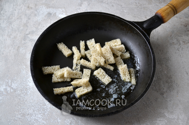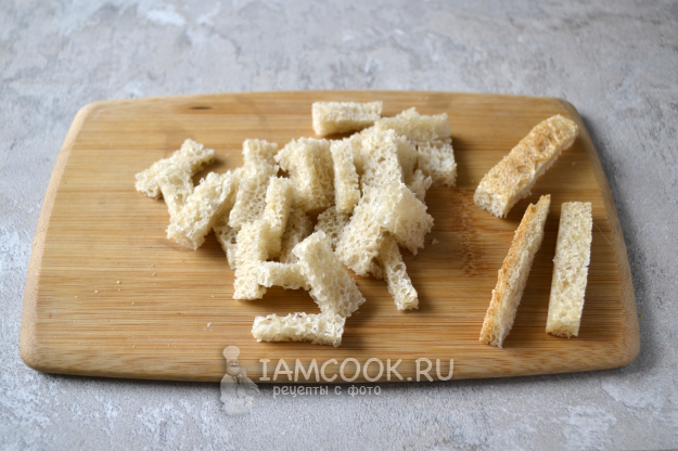 С хлеба срежьте корочки и нарежьте соломкой или кубиком.