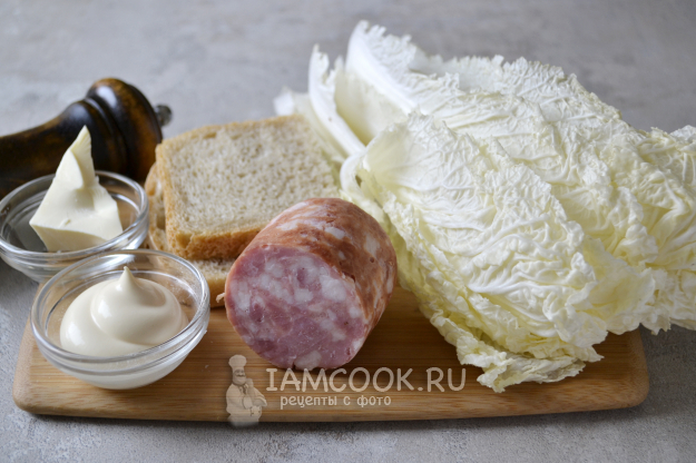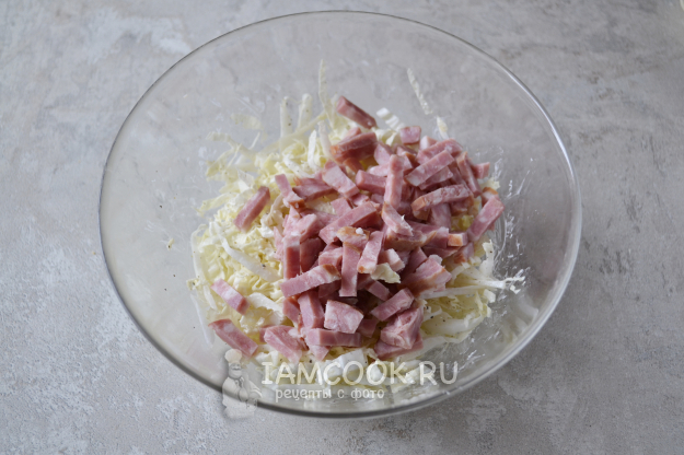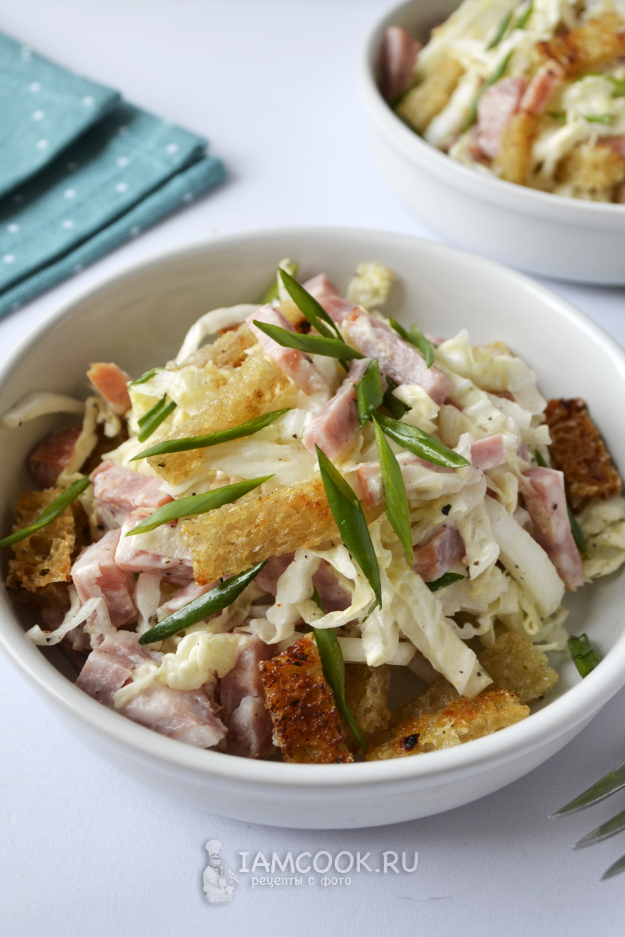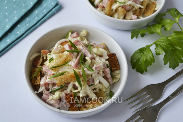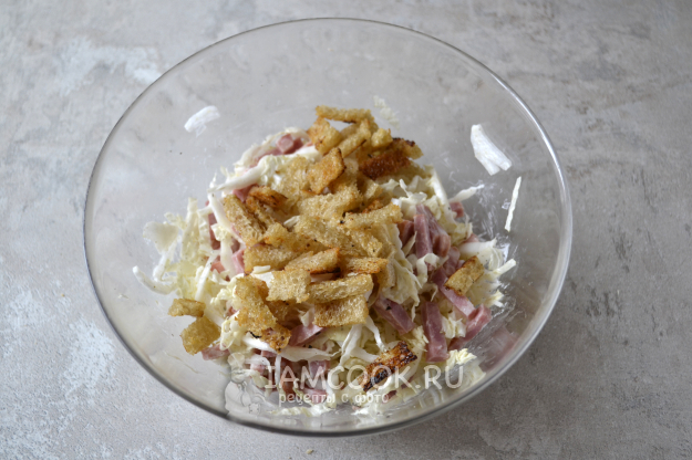 Добавьте сухарики, аккуратно перемешайте. Салат с пекинской капустой, колбасой и сухариками готов к подаче.