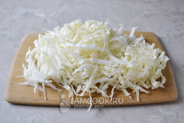 Пекинскую капусту нарежьте тонкой соломкой. Нижнюю, плотную часть листа капусты не используйте.