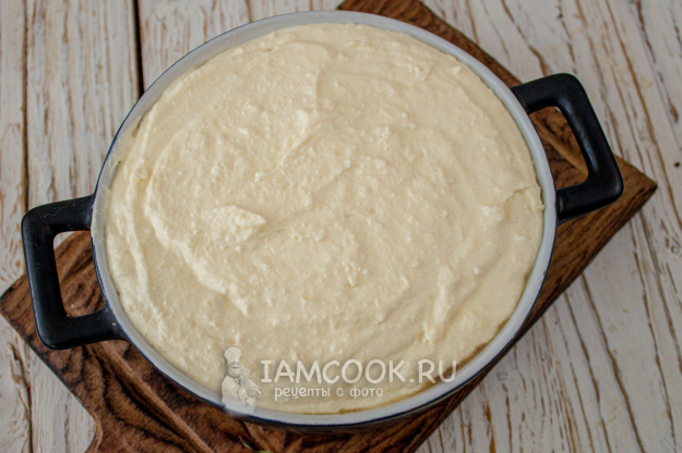 Форму для выпечки смажьте растительным маслом. На дно выложите тесто, разровняйте.