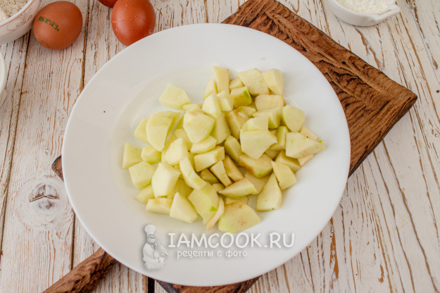 Первым делом 2 небольших яблока очистите от кожуры и семян. Нарежьте небольшими кусочками и приготовьте в микроволновке 5 минут, до мягкости яблок. Достаньте яблоки и остудите. Можно использовать готовое яблочное пюре - 150 граммов.
