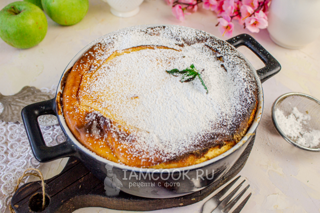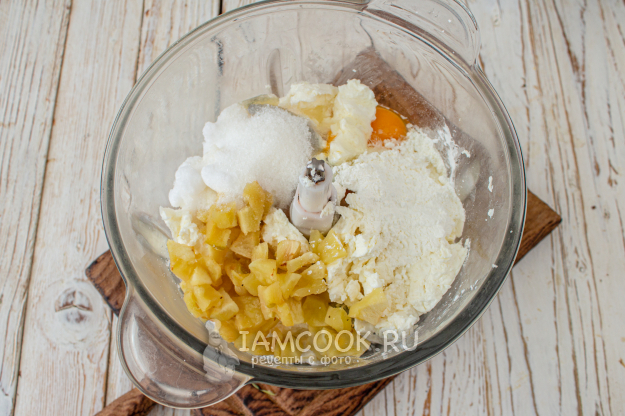 Для творожной начинки в чашу блендера выложите творог, вбейте яйца, добавьте кукурузный крахмал, сахарозаменитель, ванилин или ванильный сахар и испеченные яблоки. Пробейте массу до однородности. Если масса получается густой, то влейте 100-120 мл молока.