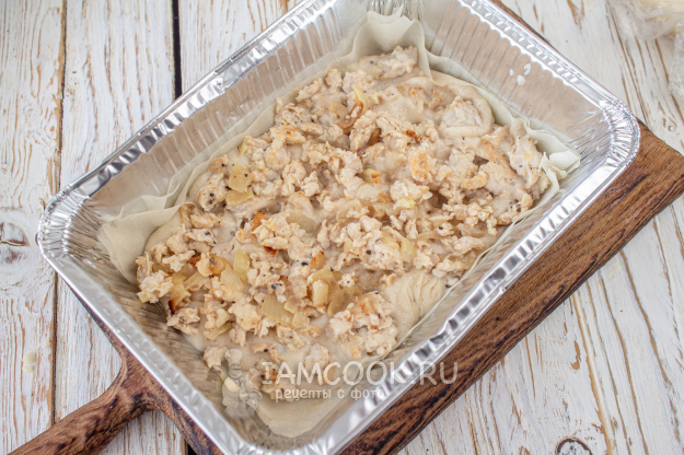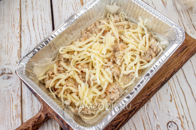 Далее повторите слои: 2 листа теста фило, 1/3 часть соуса, оставшийся фарш с луком и еще немного сыра. Поверх выложите 2 листа теста, оставшийся соус и присыпьте сыром. Поставьте в заранее разогретую до 190 градусов духовку на 15-20 минут.