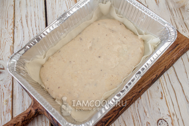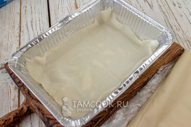 Листы теста фило нарежьте по размерам формы. На дно формы выложите 2 листа, предварительно смазав форму растительным маслом. Всего получается 6 листов теста.