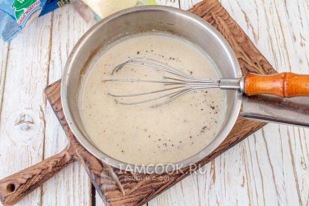 Приготовим соус "Бешамель": в сотейник выложите сливочное масло и растопите его, добавьте муку, обжарьте до слегка карамельного цвета. Затем тонкой струйкой вливайте молоко, при этом непрерывно помешивайте венчиком, чтобы не образовались комочки. Готовый соус посолите, поперчите по вкусу и добавьте щепотку мускатного ореха, накройте пленкой в контакт и отложите до остывания.