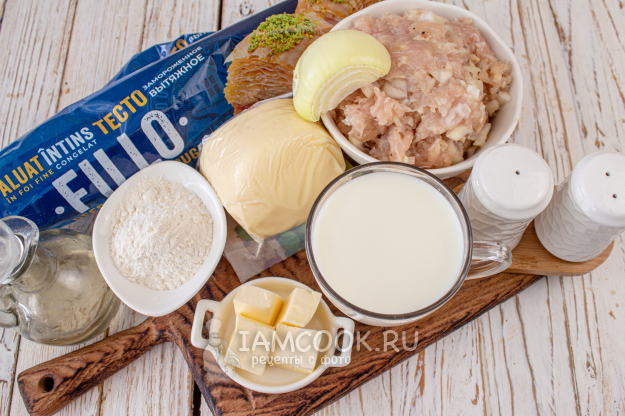 Подготовьте все необходимые ингредиенты для лазаньи из теста фило с фаршем.