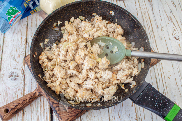 Для начинки в сковороде нагрейте растительное масло, выложите мелко нарезанный лук, обжарьте пару минут, затем добавьте фарш и обжаривайте еще 4-5 минут, чтобы он слегка подрумянился. Приправьте начинку по вкусу.