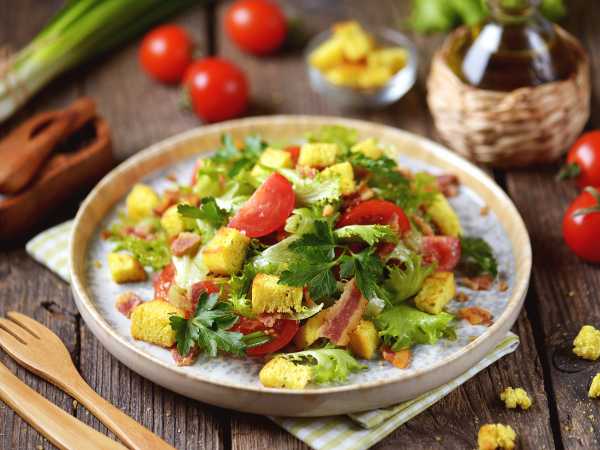 Подготовьте все необходимые ингредиенты для постного салата «Цезарь» с кальмарами.