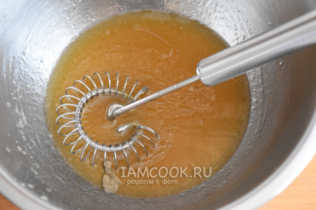 Перелить массу в миску, добавить соль, соду и перемешать венчиком. Масса начнет пениться и увеличится в объеме.