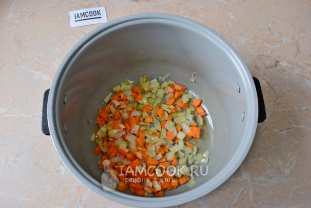 Лук и морковь необходимо очистить и нарезать. Морковь можно и натереть на крупной терке. В чашу мультиварки налейте немного растительного масла и включите режим "Жарка". Выложите лук и морковь и обжарьте 2-3 минуты, до появления характерного аромата.