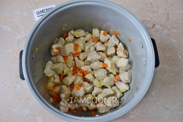 Выложите нарезанное мясо в мультиварку к овощам. Перемешайте и обжаривайте все вместе 7-10 минут. За время жарки мясо изменит цвет.