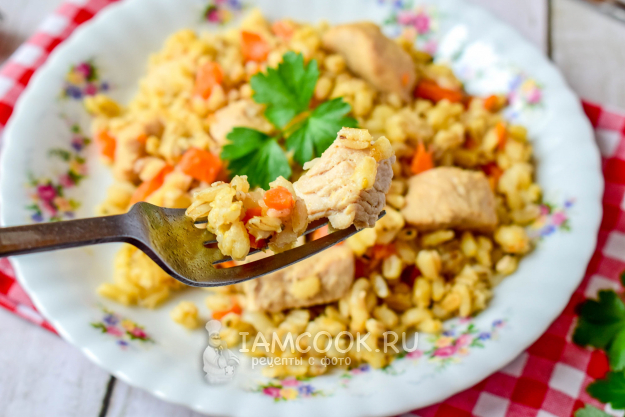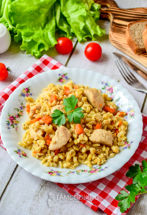 Перловка с индейкой готова! Разложите блюдо по тарелкам и подавайте к столу.
