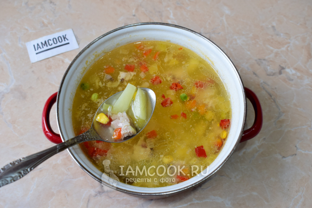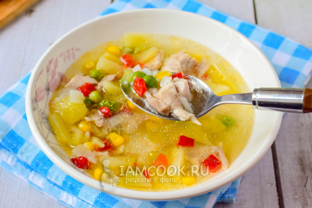 Суп с гавайской смесью и курицей готов. Снимите его с огня и дайте немного постоять под крышкой.