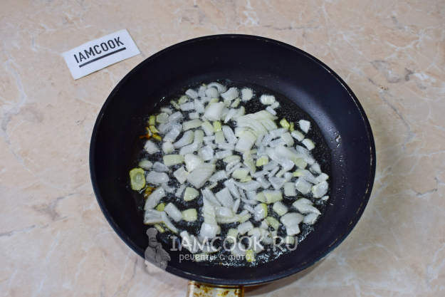 Лук очистите от шелухи, ополосните и мелко нарежьте. На горячую сковороду налейте немного растительного масла и обжарьте нарезанный лук 1-2 минуты.