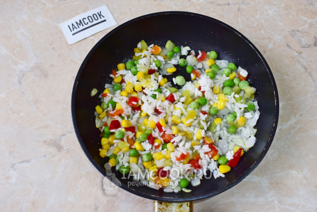 Затем добавьте к луку гавайскую смесь и обжарьте её вместе с луком еще 2-3 минуты.