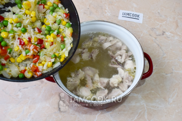 Готовую поджарку переложите в кастрюлю и варите до готовности супа еще минут 20. За это время рис должен стать мягким.