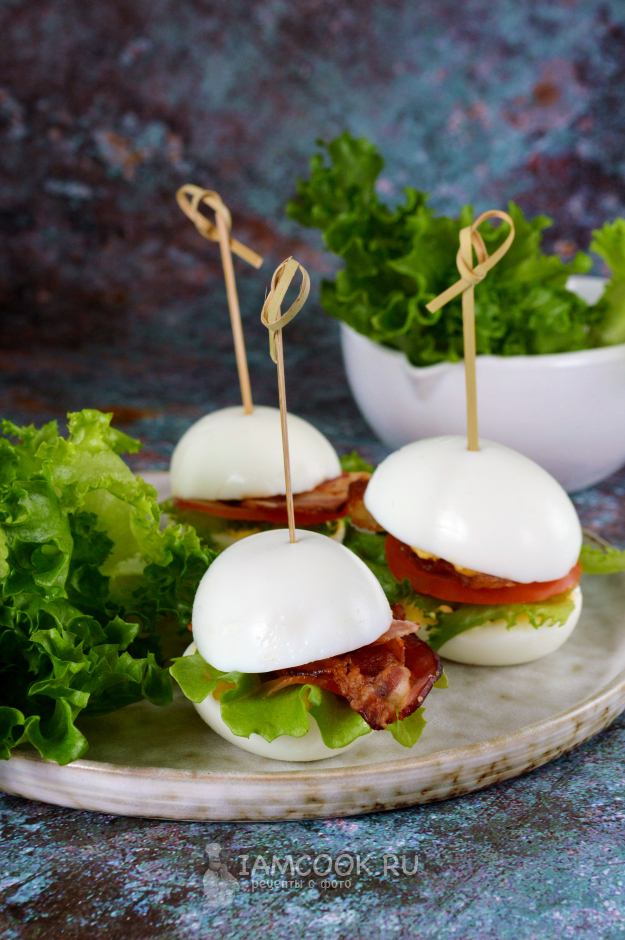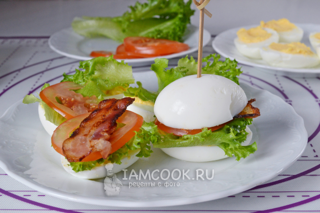 Собрать блюдо: на нижние половинки яиц выложить лист салата, кусочек помидора и ломтик бекона, накрыть другой половинкой яйца и скрепить шпажкой.