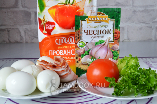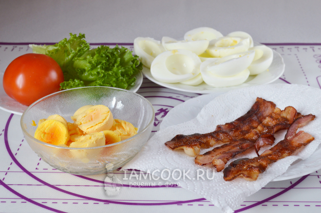 Возьмите необходимые ингредиенты для приготовления фаршированных яиц с беконом и помидором. Яйца отварить вкрутую, остудить и очистить от скорлупы. Бекон пожарить на сухой сковороде до золотистого цвета, выложить на бумажные полотенца.