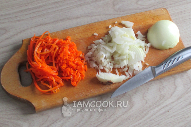 Через полчаса отправьте в суп нашинкованные лук, морковь и измельченный чеснок. Мне нравится добавлять морковку по-корейски, но традиционно идет свежая.