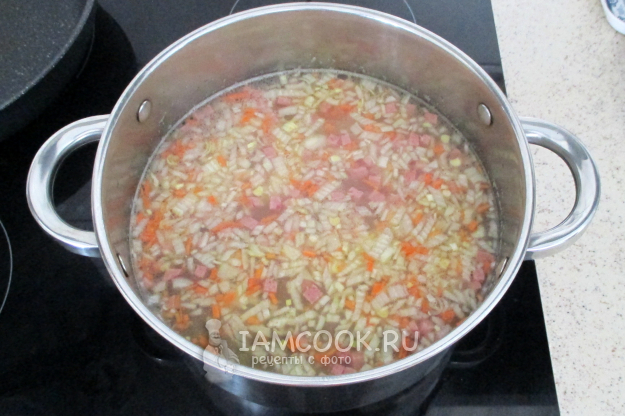 Для довольно жирного супа с колбасой и копченостями овощи лучше не обжаривать, но как хотите...