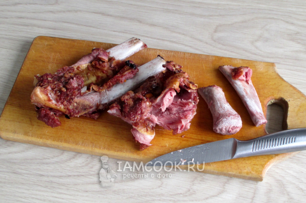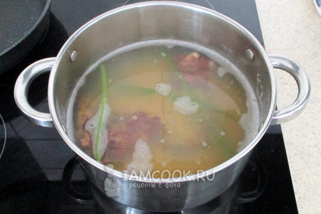 Из практически готового супа уберите стебли укропа. Достаньте ребра, срежьте с них мясную часть, нарежьте её помельче и верните в суп. Рекомендуется ещё раз довести до закипания и выключить.
