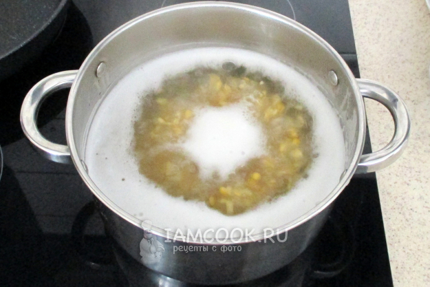 Подготовленный горох залейте холодной водой и доведите до закипания. Периодически помешивайте, чтобы не прилип ко дну кастрюли. Следите! Образуется большое количество пены, её можно снять или оставить, кто уж как привык.