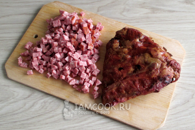 Затем добавьте свиные копченые или варено-копченые ребра и нарезанную на кусочки (кубики, брусочки) полукопченую колбасу (Прима, Краковская, Охотничья, Салями, Сервелат и т.п.).
