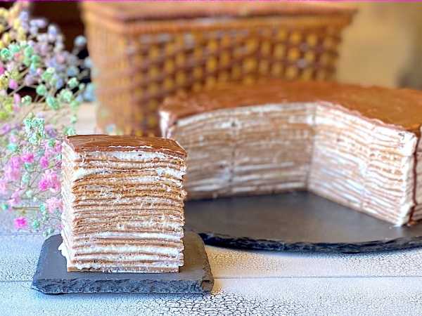 Затем разрежьте блинный торт с белковым кремом на порции и подайте к столу с горячими напитками.