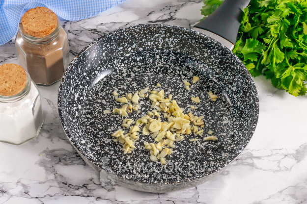 Чеснок очистите от шелухи и промойте в воде. Нарежьте мелкими слайсами или спрессуйте через специальный гаджет (чеснокодавилку) прямо на сковороду с растительным маслом. Прогрейте сковороду на плите и обжарьте чеснок 1 минуту. Если вы добавочно решите поджарить и нарезку лука, то сначала 2-3 минуты обжарьте лук. Затем всыпьте чесночную нарезку, обжарьте еще 1 минуту. Нагрев уменьшите до умеренного.