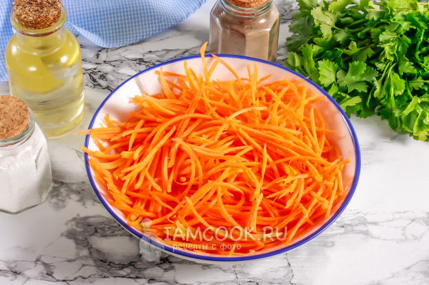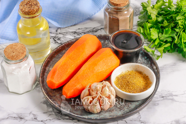Возьмите необходимые ингредиенты для приготовления моркови по-корейски с соевым соусом.