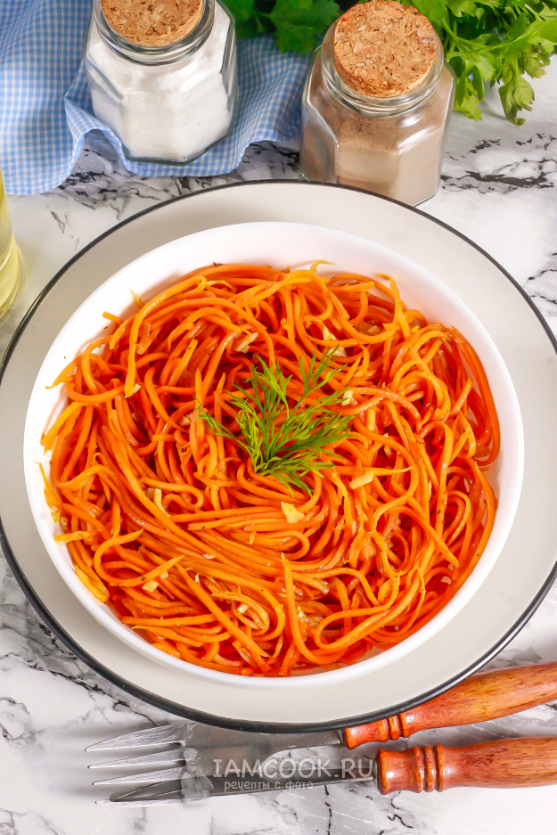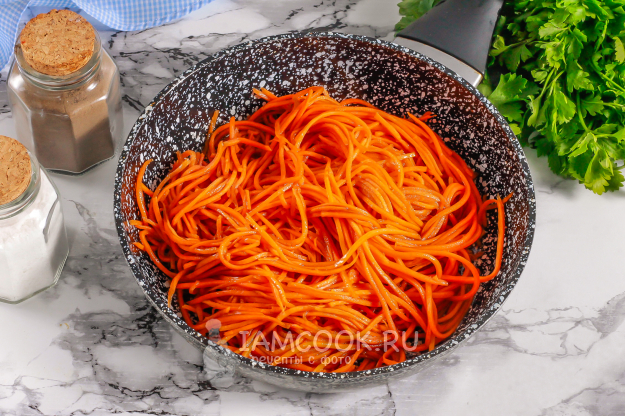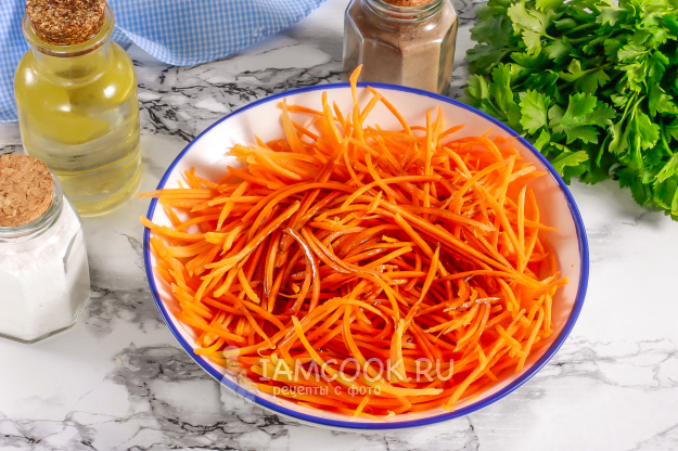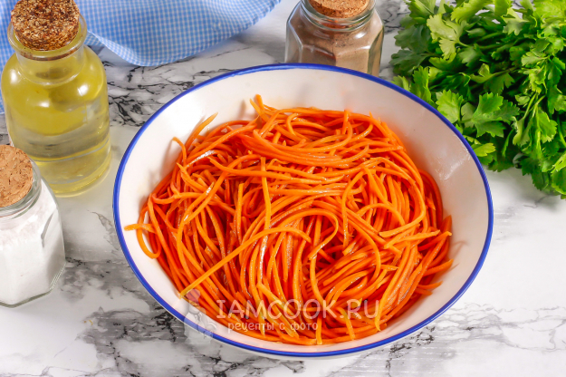 Морковь по-корейски с соевым соусом готова. Выложите её в пиалу или глубокую тарелку и остудите. Подайте к столу охлажденной.
