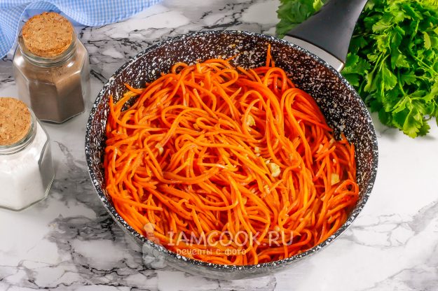 Отожмите морковь от соевого соуса и выложите на сковороду.