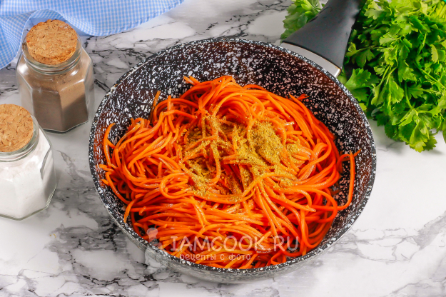 Всыпьте приправу для моркови по-корейски, соль и молотый черный перец. Приобретайте ее по своему вкусу: горькую, средней горечи или без горечи.