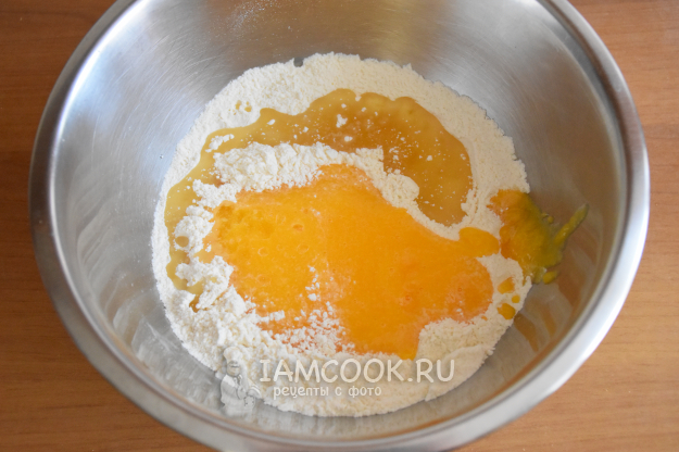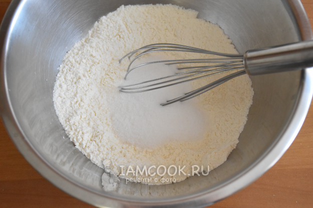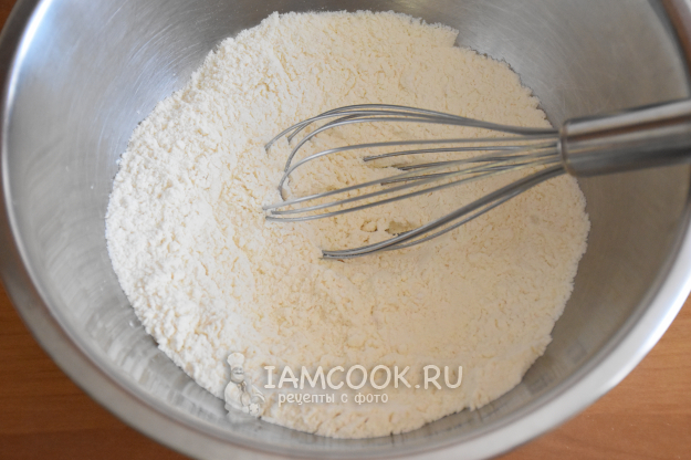 В миске соединить муку и разрыхлитель, перемешать венчиком.
