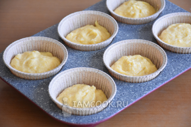 Выложить бумажные капсулы в формочки для маффинов и аккуратно заполнить капсулы тестом на 2/3.